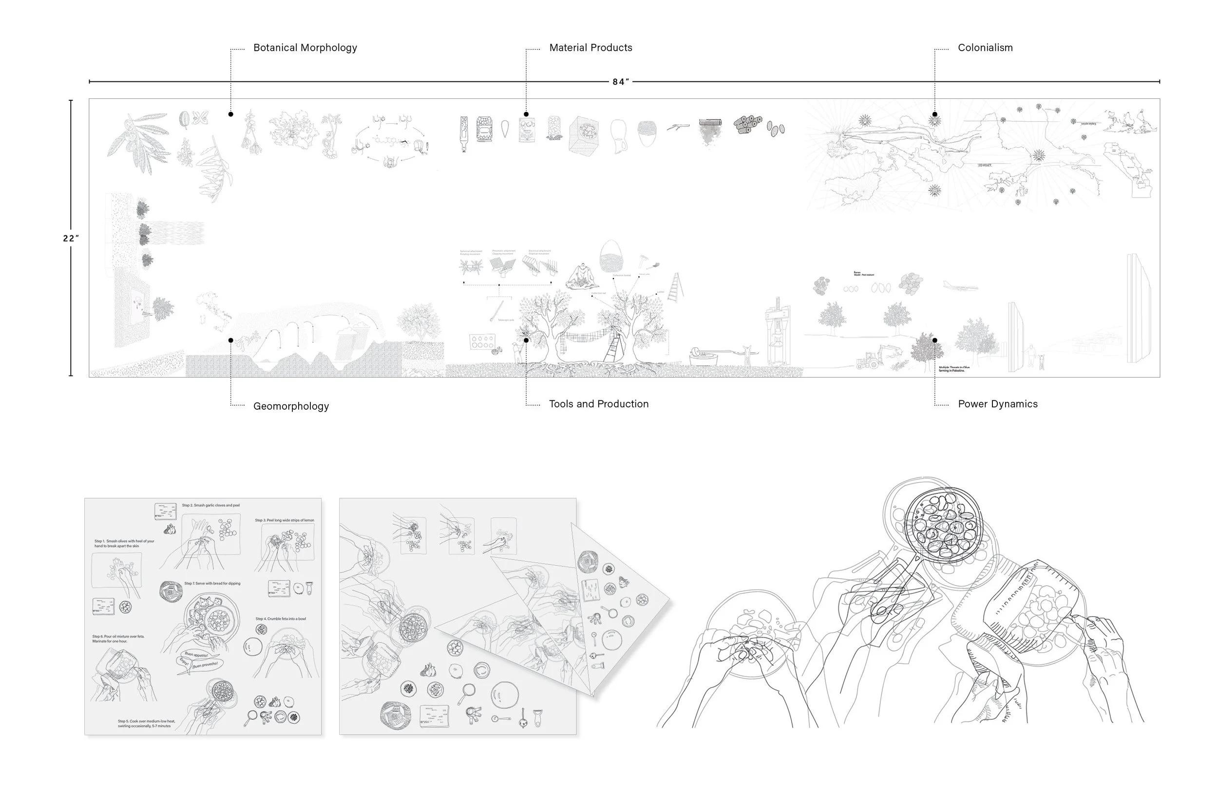 This project explores the relationship between the food we consume and the landscapes from which they originated. Drawing is used as a method to unpack food systems and their inextricable geomorphology, climate, infrastructure, and cultural productions.